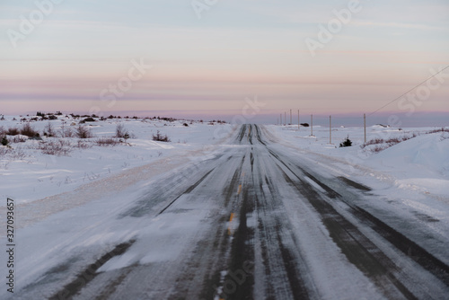 A black paved road with blowing snow crossing its road surface.The sky on the horizon is pale pink and soft orange color as the sun sets.The sides of the road are flat barren land covered in snow.