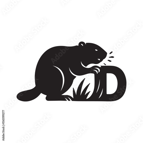 A black silhouette of a beaver standing on the letter d with grass in the background