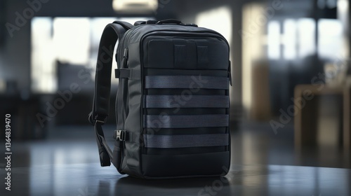 A black tactical backpack featuring multiple straps and compartments rests on a table in a well-lit indoor space. The sleek design highlights optimal functionality and style