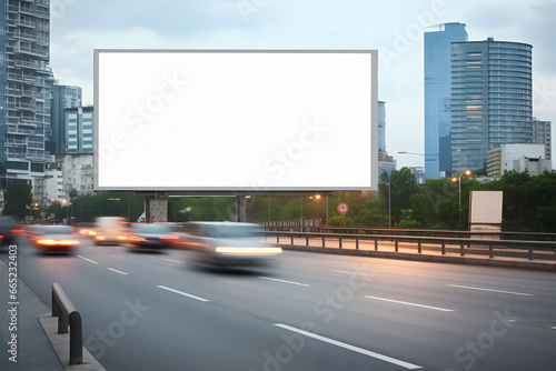 a blank billboard on the side of a busy highway with tall buildings in the background.