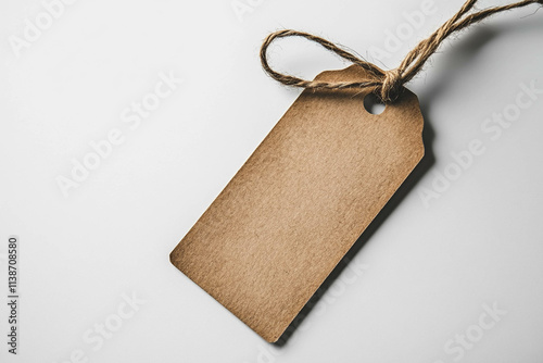 A blank brown paper tag with a string attached, placed on a light background. Ideal for labeling or gift tagging.