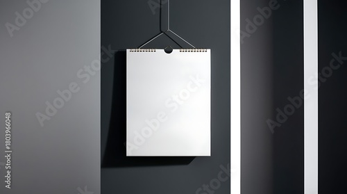A blank calendar with a clean grid layout outline, simple typography, and subtle texture, hanging on a dark charcoal wall with a smooth finish, illuminated by controlled studio lighting.
