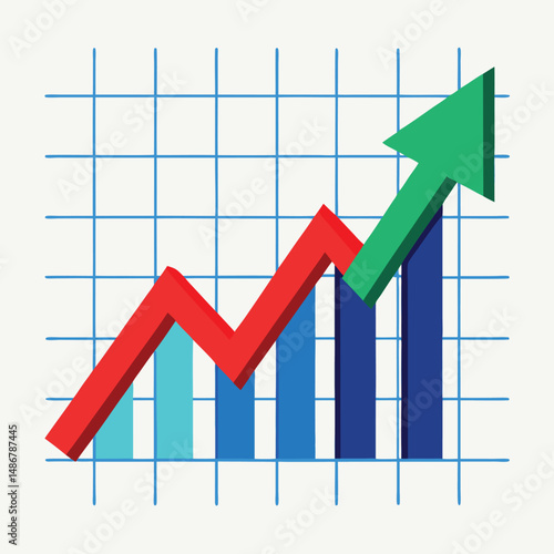 A blue arrow sharply trending upwards over fluctuating red and green lines on a grid with white background