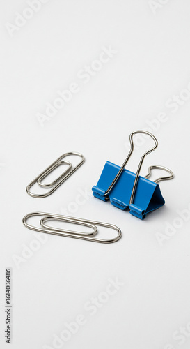 A blue binder clip and two silver paperclips are arranged on a plain white background