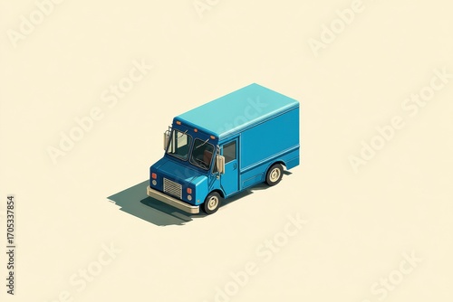 A blue delivery truck is parked on a minimalistic light background, showcasing an isometric view. This design highlights the vehicle's shape and details, ideal for urban transport themes