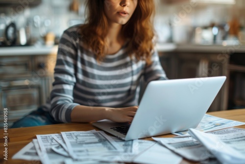 blurred, woman, laptop, working, document, sharpened, technology, business, home office, concentration, paperwork, freelancer, productivity, indoor, modern, entrepreneur, multitask, study, planning, professional, finance, casual attire, wireless, cyberspace, desk, research, occupation, communication, task, organisation, home, paper, online, efficiency, project, analysis, deadline, tied-up, table, strategy