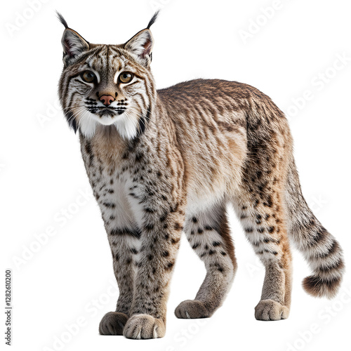 A bobcat standing on a white background, displaying its spotted fur and ear tufts.