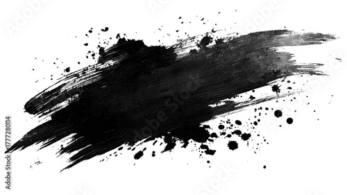 A bold black brushstroke with streaks and splatters, conveying texture and artistic flair.