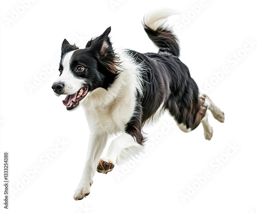 A border collie in a dynamic pose, caught mid-stride, motion freeze effect highlighting its agility, bright and crisp lighting, clean white background.