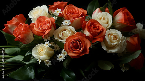 rose, bouquet, flower, orange, white, floral, arrangement, blossom, flower petals, bloom, greenery, leaf, black, background, elegant, romantic, gift, nature, flora, beauty, vibrant, delicate, blooming, decorative, fresh, display, celebration, special, occasion, colourful, botanical, blossom, plant, garden, valentine, day, anniversary, love, bright, soft, beautiful, closeup, natural, texture, detailed, artistic