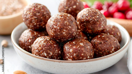 A bowl filled with homemade energy balls made from nuts and seeds, representing a healthy and nutritious snack