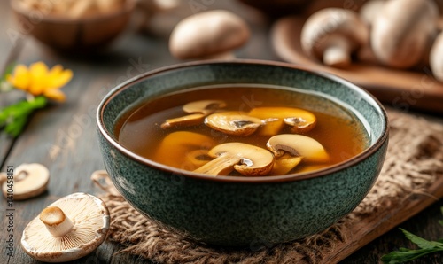 A bowl of clear mushroom soup with sliced mushrooms, garnished with fresh herbs on a rustic wooden table.