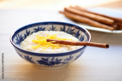 a bowl of creamy rice pudding with a cinnamon stick garnish