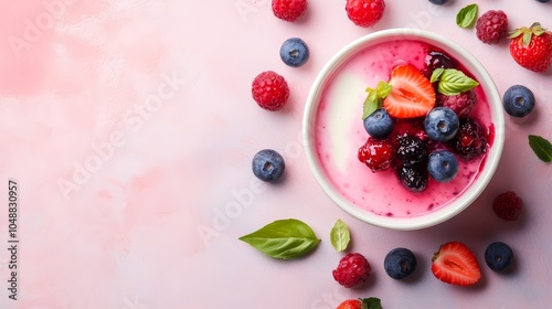 A bowl of creamy yogurt topped with fresh berries, surrounded by raspberries, blueberries, and strawberries on a pink background.