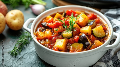 A bowl of flavorful summer vegetable stew with zucchini, potatoes, peppers, onions, tomatoes, and eggplant, shown in close-up on a table