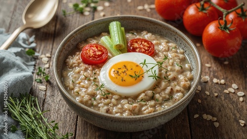 bowl, oatmeal, cherry tomato, celery, garnished, herb, side dish, healthy, alimentary, breakfast, lunch, vegetarian, protein, vegetable, colourful, wholesome, natural, fresh produce, culinary, meal, farm fresh, dietary, organic, seasonal, vibrant, kitchen, epicure, rustic, no people