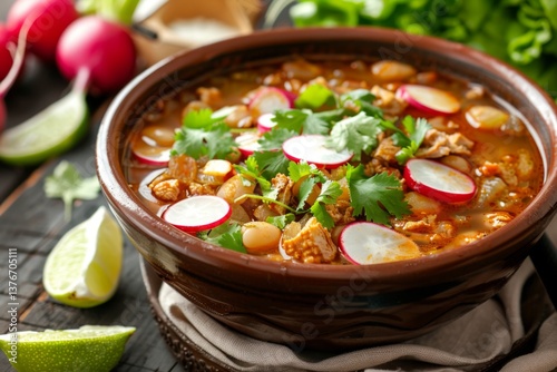 A bowl of pozole soup garnished with radishes, lettuce, and lime wedges