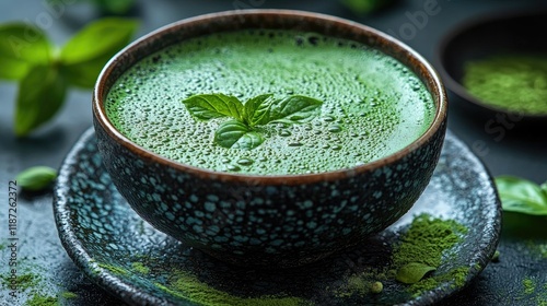 matcha, tea, green, bowl, mint, garnish, drink, beverage, healthy, japanese, ceremony, powder, leaf, cup, ceramic, dark, textured, vibrant, fresh, organic, smooth, frothy, delicious, aromatic, relaxing, zen, calm, serene, wellness, energy, antioxidant, natural, traditional, culture, ritual, hot, cold, preparation, steamed, water, cookery, favor