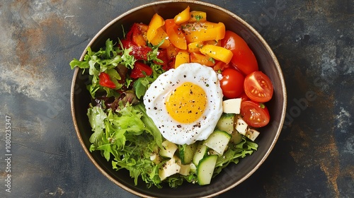 A bowl of salad with a fried egg, bell peppers, tomatoes and cucumbers.