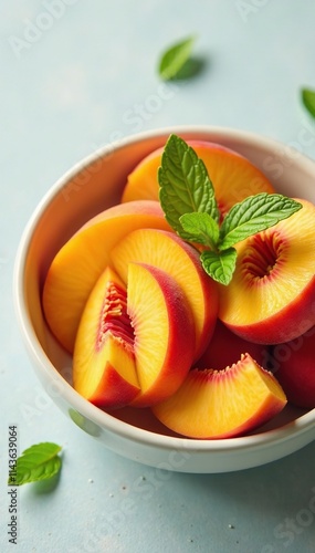 A bowl of sliced peaches with a few sprigs of fresh mint leaves scattered around the rim, peach, fruit