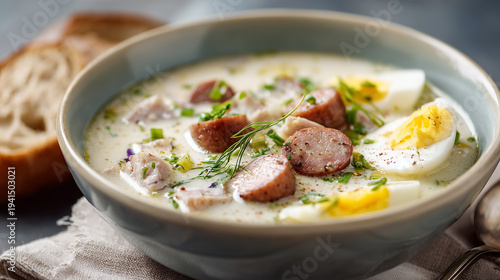 bowl, soup, spoon, piece, bread, table, creamy, floating, cosy, delicious, inviting, dish, food, tasty, white, potato, meal, garlic, traditional, lunch, closeup, dinner, rustic, pepper, homemade, celebration, parsley, fresh, plate, sour, polish, salt, vegetable, onion, sourdough, easter, wooden, fermented, flour, rye, silver, sausage, egg, vintage, bay, poland, cookery, epicure