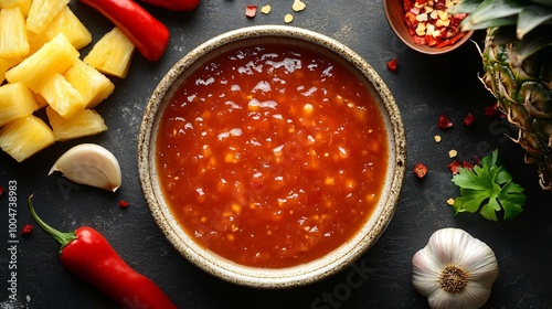 A bowl of sweet and sour sauce surrounded by pineapple chunks, garlic cloves, and red bell peppers
