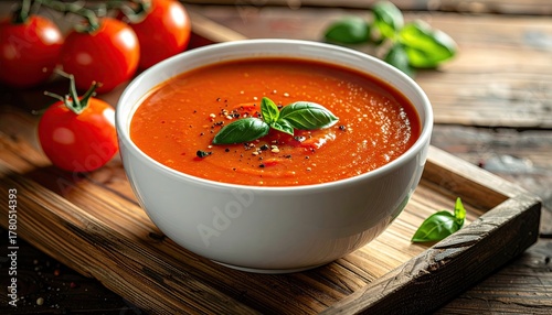 A bowl of vibrant red tomato soup garnished with fresh green basil leaves and black pepper seeds served on a rustic wooden tray with ripe tomatoes in the background