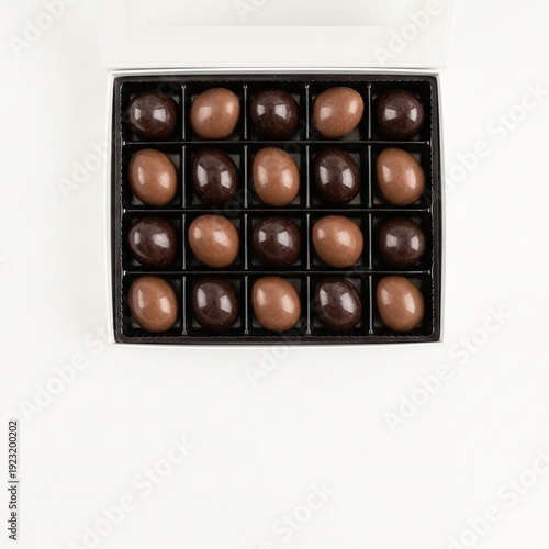 chocolate, truffle, sweet, candy, dessert, box, package, treat, snack, food, confectionery, delicious, tasty, sweet, indulgent, luxury, epicure, dark, milk, brown, white, background, isolated, product, photo, studio, shot, closeup, view, assortment, variety