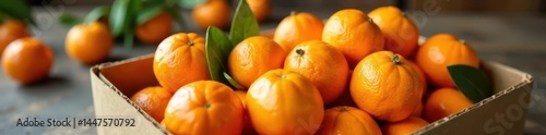 A box overflowing with bright orange clementines , still life, round, delicious