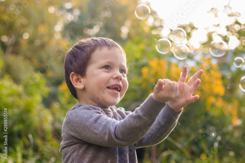 A boy on the street catches soap bubbles. Happy childhood. Children's games.