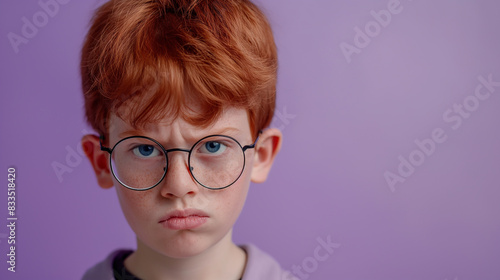 A boy with red hair and blue eyes with glasses is looking at the camera, with angry face on light purple background