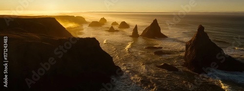 breathtaking, aerial, perspective, rugged, coastline, sea, stack, along, oregon, coast, sunrise, scene, cinematic, style, photo, dramatic, natural, sculpture, coastal, beauty, rocky, outcrop, gold, morning, sky, high, quality, image, texture, silhouette, horizon