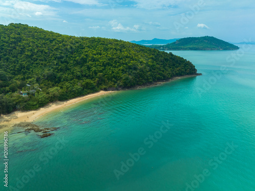A breathtaking aerial view of a lush green coastline with winding paths, crystal-clear turquoise waters, and distant islands under a partly cloudy sky. Lam Nga is in Silay island Phuket. green sea