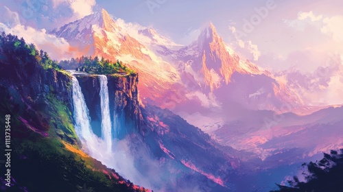A breathtaking landscape featuring a majestic waterfall cascading down a rocky cliff amidst vibrant mountains at sunset.