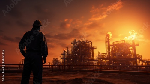 A breathtaking photograph of an architect, their gaze fixed on the horizon, standing atop an oil rig that stands as a beacon of human ingenuity amidst the desolate beauty of the desert.