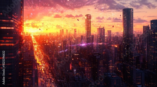 A breathtaking sunset cityscape with high-rise buildings and busy streets, vibrant lights reflecting off the glass skyscrapers as the sun sets