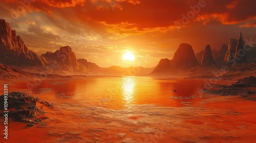 A breathtaking sunset over a surreal, red-hued landscape with rocky formations and calm water.