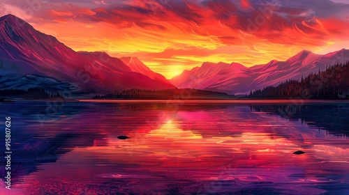 A breathtaking sunset over tranquil waters reflecting a vibrant sky near majestic mountains