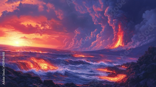 A breathtaking volcanic landscape features glowing lava cascading down a mountainside, dark smoke billowing into a vibrant twilight sky, capturing the awe of nature's raw power.
