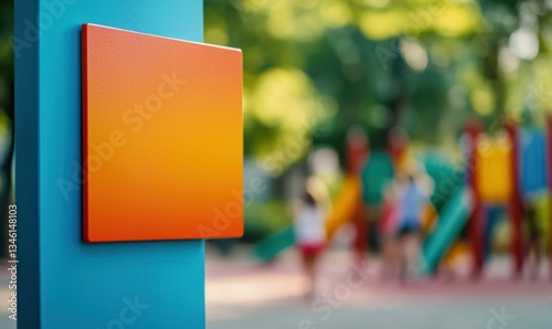 A bright orange square sign on a blue post stands in front of a colorful playground with children.