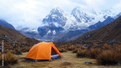 A bright orange tent set against a stunning mountainous backdrop, showcasing the beauty of nature in a serene landscape.