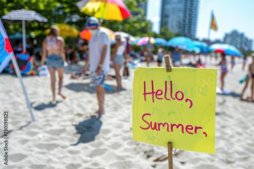 A bright yellow sign on a sandy beach facing the ocean, proudly proclaiming Hello, Summer in bold black letters, welcoming the warm season