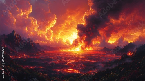 A brilliant lava flow pours down the volcanic slopes as the warm sunset colors fill the sky with drifting dark smoke