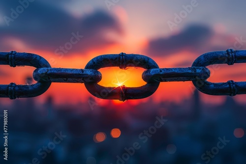 A broken chain link above a silhouette of a developing cityscape