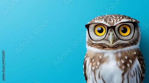 A brown and white owl with glasses is staring at the camera. The owl is wearing glasses and has yellow eyes. The image has a playful and whimsical mood, as the owl is dressed in human-like clothing