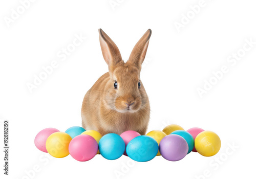 A brown bunny rabbit surrounded by colorful easter eggs on a white background. isolated on transparent background