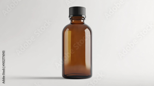 a brown glass bottle with a black cap on a white background. Amber medical or cosmetic mockup.