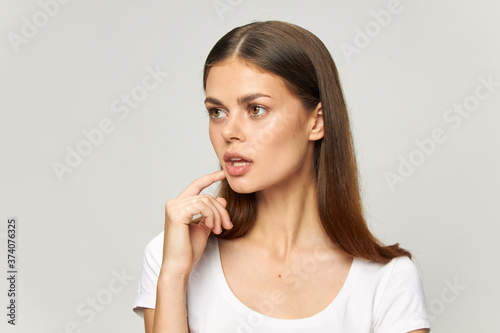 A brunette woman in a white T-shirt on an isolated background holds a finger near the face