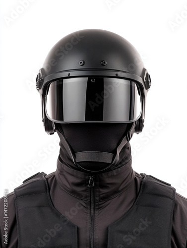 A bulletproof riot control helmet with visor and chinstrap, isolated on a white background