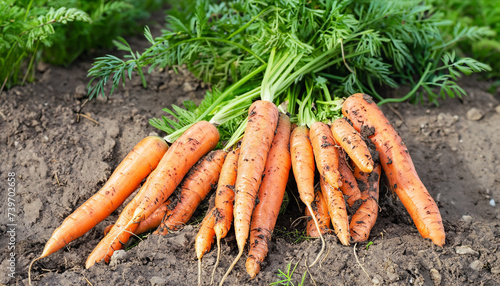 A bunch of fresh carrots with greens on the ground. A large juicy unwashed carrots in the field against the background of the earth close up.